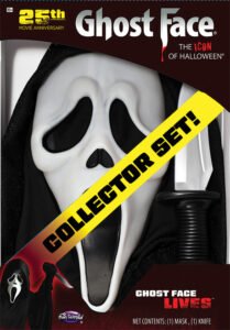 Scream (1997): 25 years ago, moviegoers were introduced to a creepy, menacing antagonist that would permeate the horror and pop culture landscape. Its magnitude prior to that moment had not been seen since a gigantic, machete-wielding maniac in a hockey mask had slaughtered his way through the teenage population of Camp Crystal Lake back in 1981. Jason Voorhees was the literal slasher symbol of terror and his mask became the costume prop of choice for millions of Halloween enthusiasts worldwide. In 1997 Wes Craven introduced a new generation to a new figure; a black-cloaked villain who would bring forth a new wave of fear and excitement, appearing almost out of thin air and disappearing just as swiftly. His face was hidden beneath a latex creation that resembled a type of warped, distorted phantom. ‘Ghost-face’ became the penultimate anti-hero and that infamous mask has continued to both disarm and delight generations since its screen debut. Now, with the 5th instalment of the film franchise in its current release, there is solid proof that if something isn’t ‘broken’ then quite simply don’t fix it. The success of that formula has meant that Scream-themed movie merchandise and collectibles are plentiful.